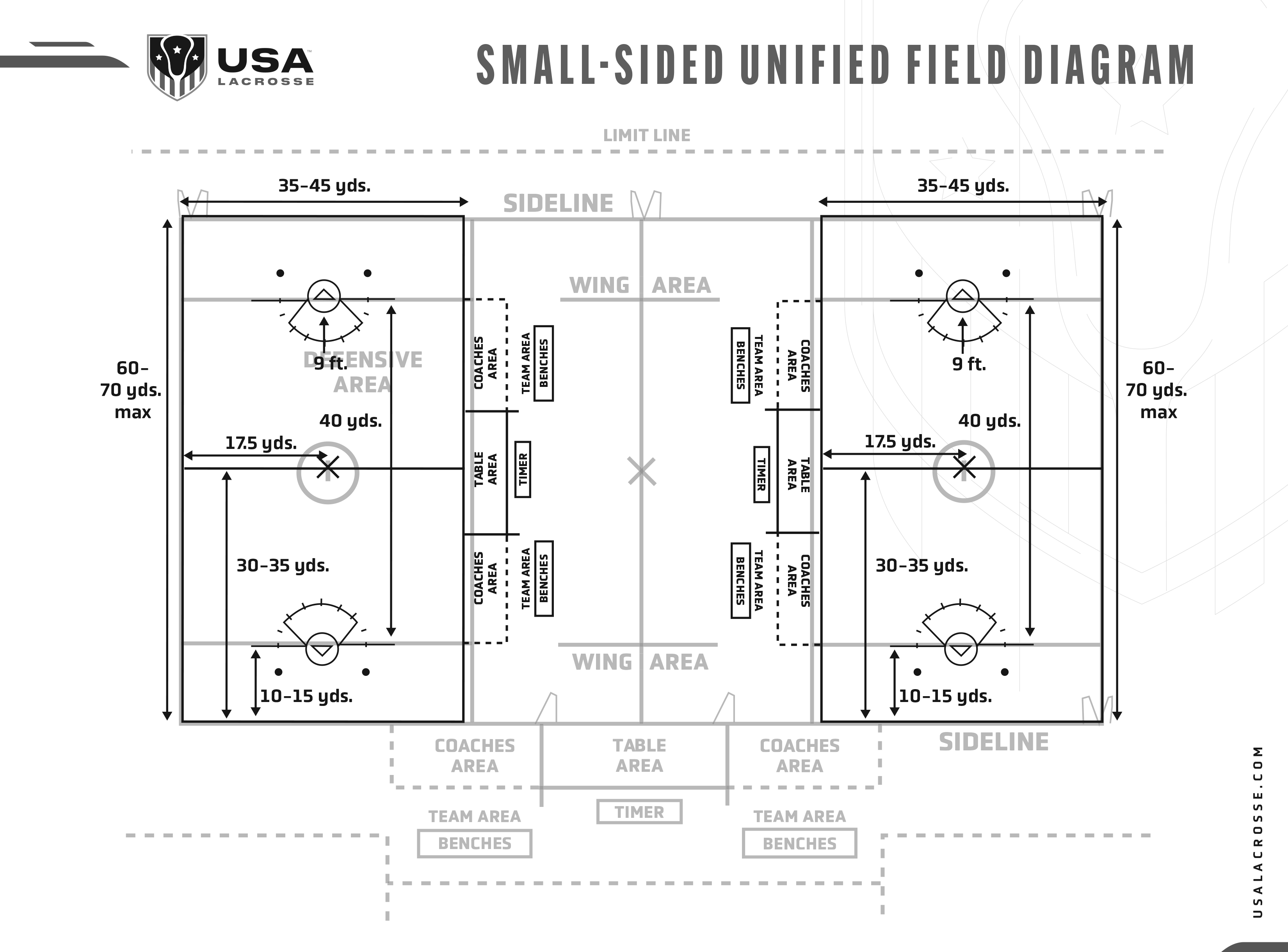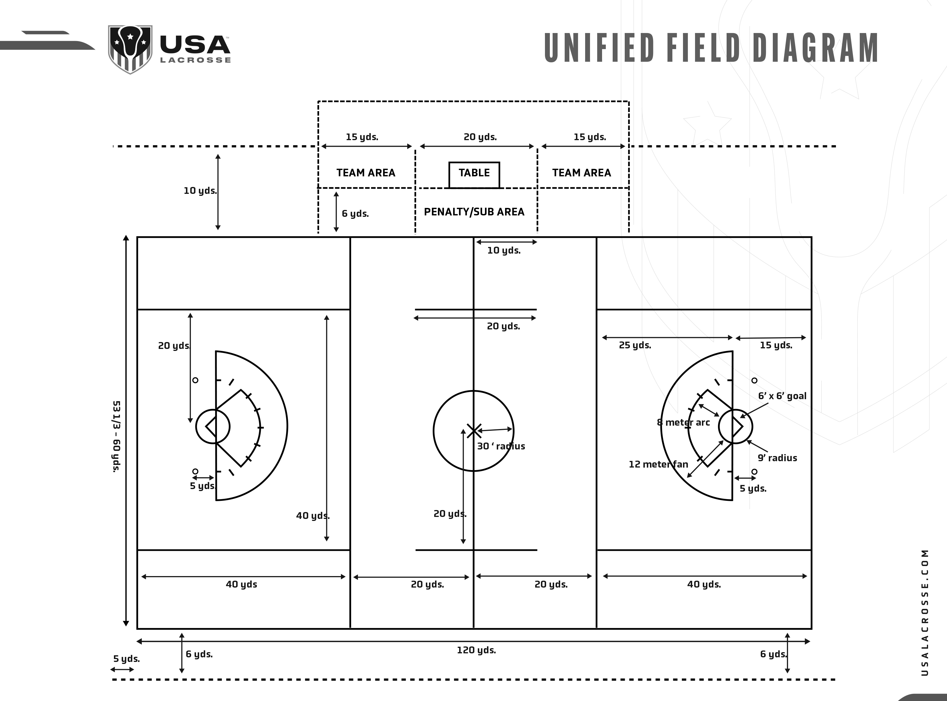 Home Field Diagrams USA Lacrosse provides field diagrams to assist you in properly outlining your field dimensions.Men's Field DiagramsRegulation Men's Field How to Line a Men's Field Women's Field DiagramsRegulation Women's Field How to Line a Women's FieldUnified Boys' & Girls' Field DiagramsUnified Boys' and Girls' HS Field How to Line a Unified Boys' and Girls' Field Unified Youth Field Small-Sided Unified Boys & Girls Field